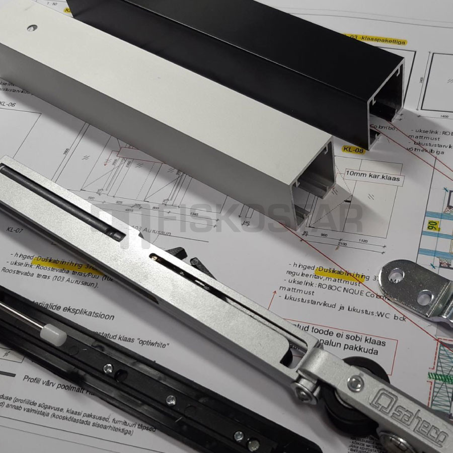 Komplekt ühele ukselehele koosneb rullikutest koos kahekordse „softclose“ süsteemiga, stopperist ja juhikust.